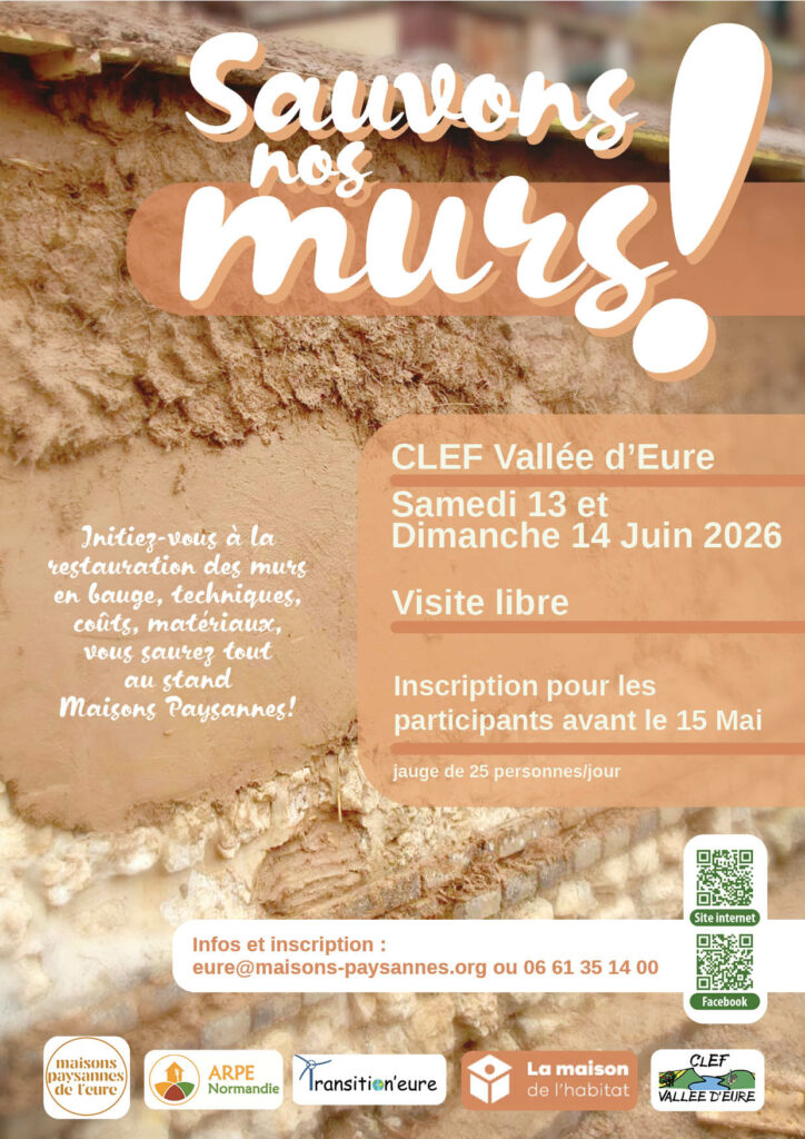 Envie de découvrir les secrets des constructions en terre crue ? Les associations Transition’Eure, Maisons Paysannes de l’Eure et ARPE Normandie, ainsi que La Maison de l’habitat et la commune de Clef Vallée d’Eure organisent un weekend dédié à la restauration de murs en bauge les samedi 13 et dimanche 14 juin 2026.